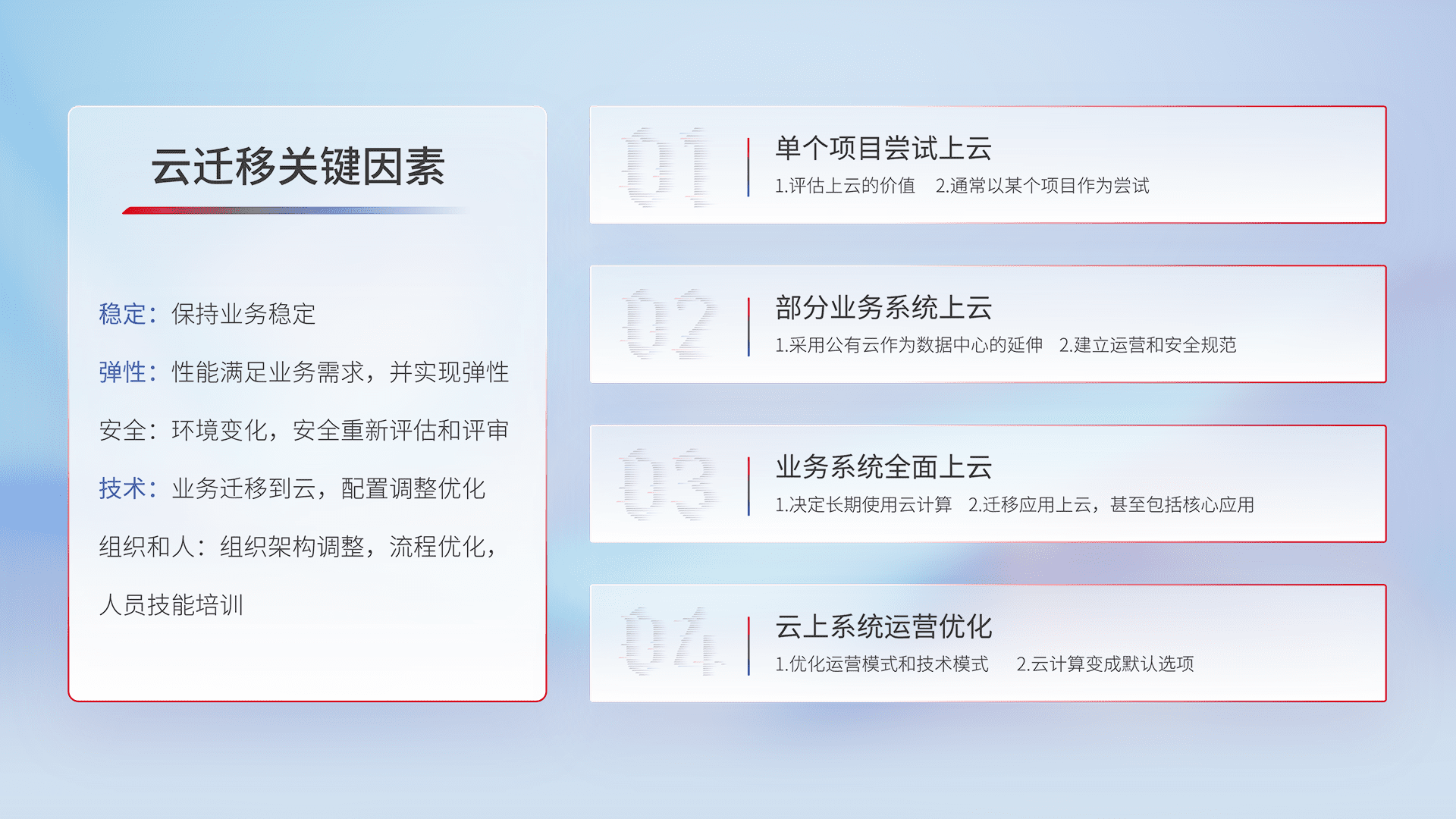 结合实际业务,,,从规划设计、、、、云平台选型、、、云原生改造、、数据迁移、、、集成交付,,,,迁移全过程为客户识别最佳上云路径,,,做好风险识别管理,,,设计网络架构、、、身份权限、、、安全审计合规、、操作审计、、、、日志审计、、、监控告警策略、、、多站点容灾设计等,,对云上基础设施进行整体规划,,提升IT治理水平,,,,以满足弹性、、、、高可用、、高性能的需求。。。。