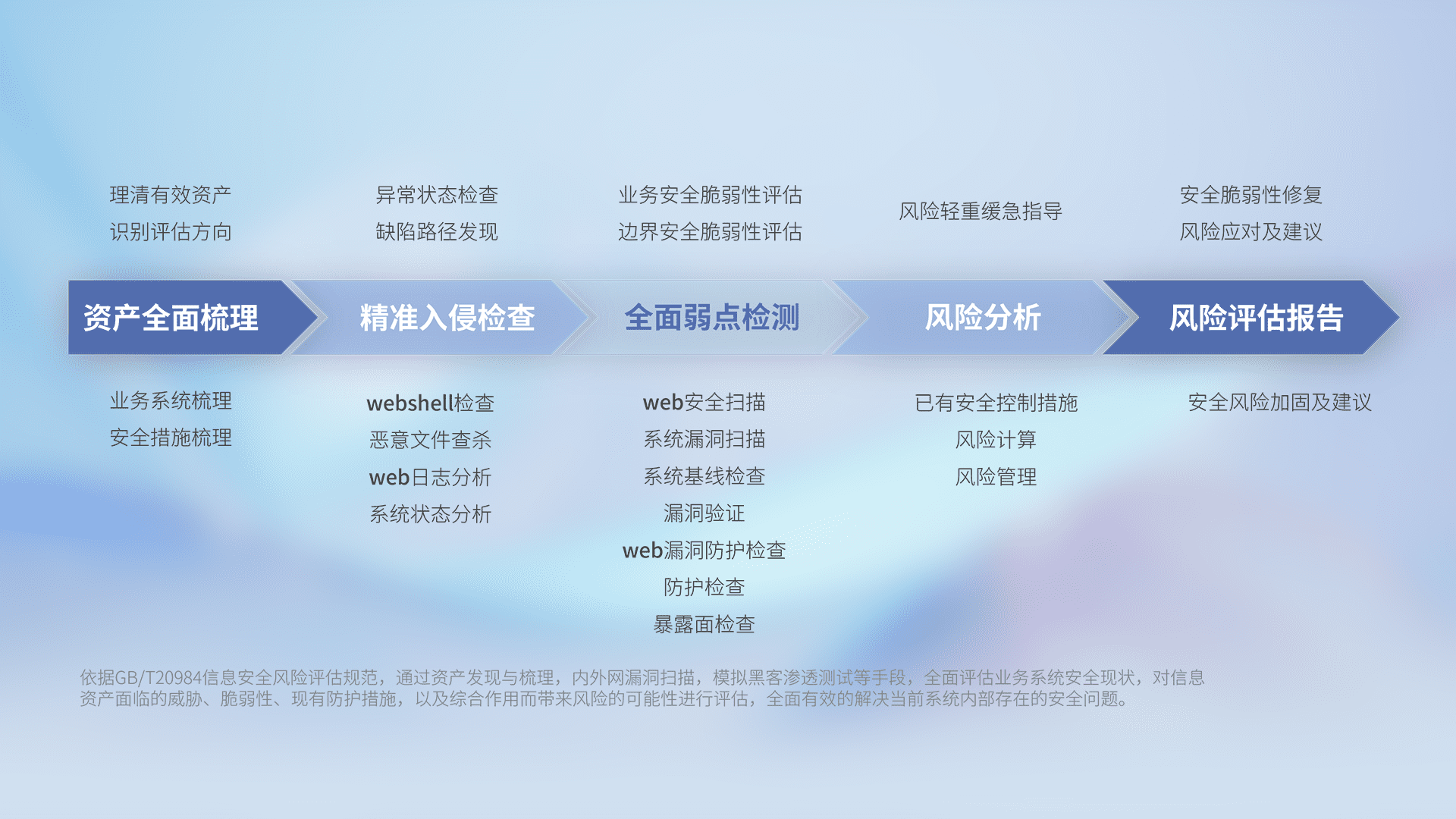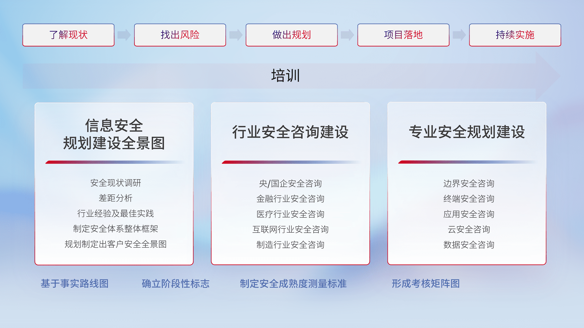 针对客户行业特性,,,,以专业的安全服务+多厂商联合解决方案提供专属的一站式安全管理服务,,,,帮助客户全面感知网络空间威胁,,,基于识别、、、检测、、、分析、、、、防护、、、、监测、、、、响应的服务理论模型,,从方案咨询、、、、集成交付、、评估验证、、优化加固、、、、运维运营,,致力于为客户提供完整的闭环管理式安全服务。。以实战经验为客户打造高抵御风险的安全体系,,,帮助客户发现威胁、、、对抗威胁、、、处置威胁,,不断积累安全对抗能力,,,,持续保障数字化安全。。。。